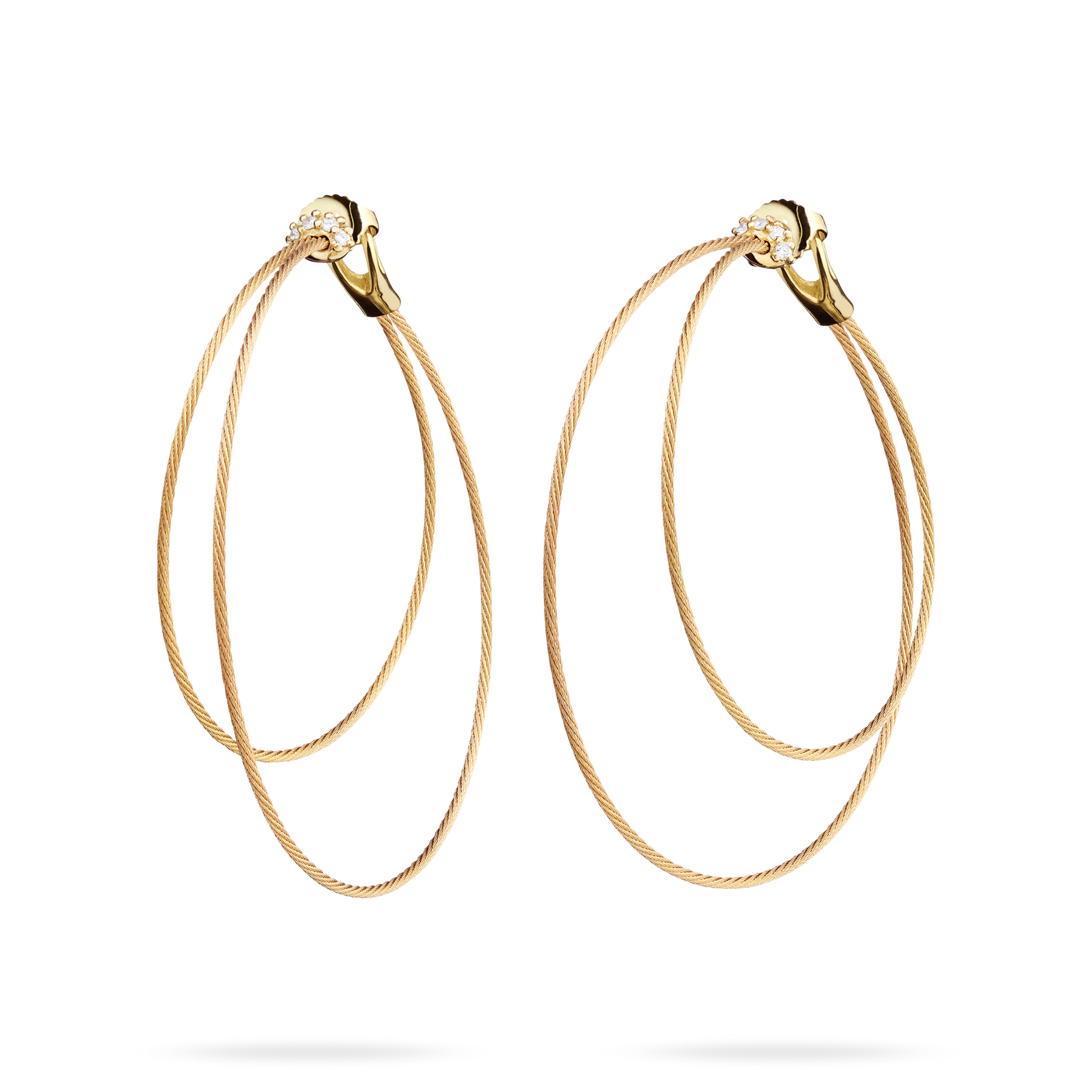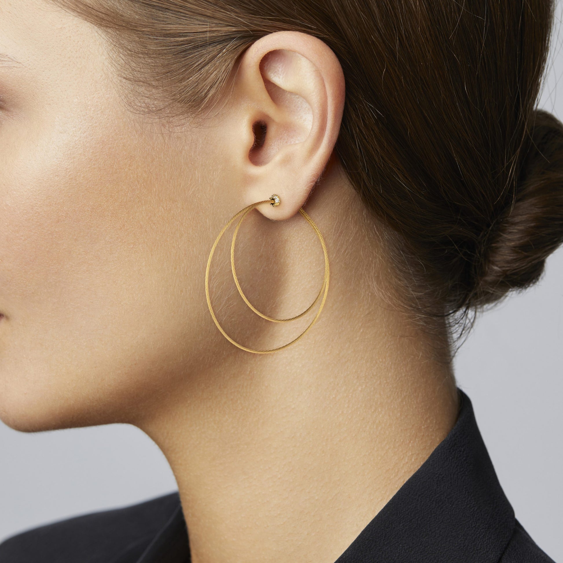 40mm and 50mm by 1mm hoops in 18k yellow gold with brilliant cut white diamonds (.10 carats). Secured with a unique post/clutch that´s attached to the earring.