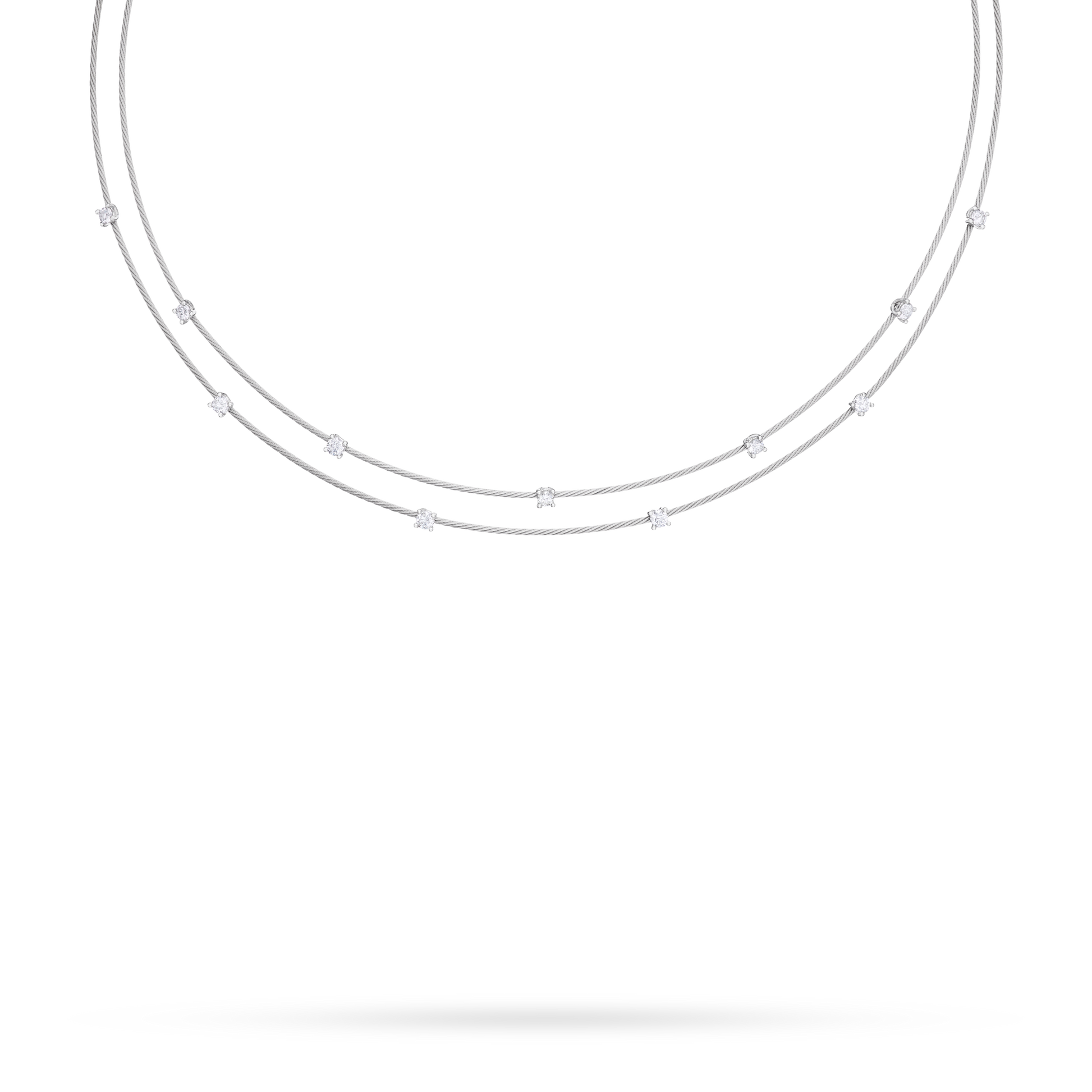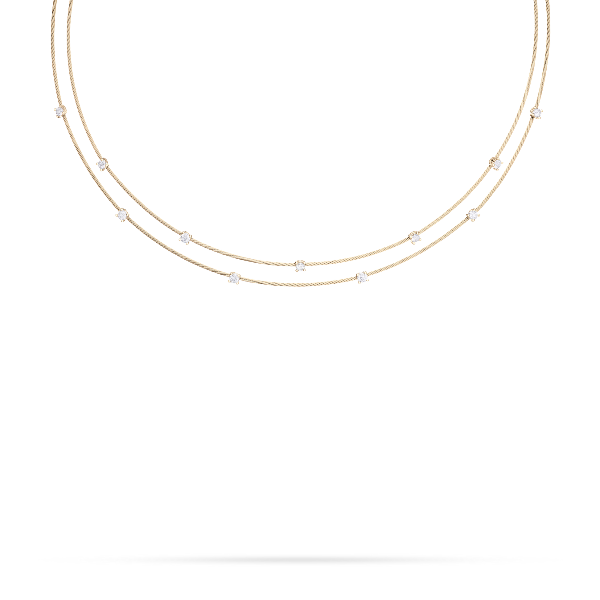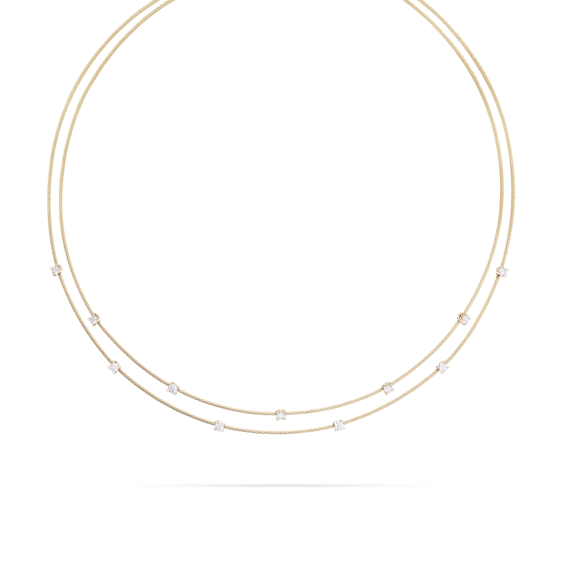 Ethereal yet industrial; simple and understated; a pair of flexible gold strands is studded with 11 round diamonds, signifying two lives entwined.