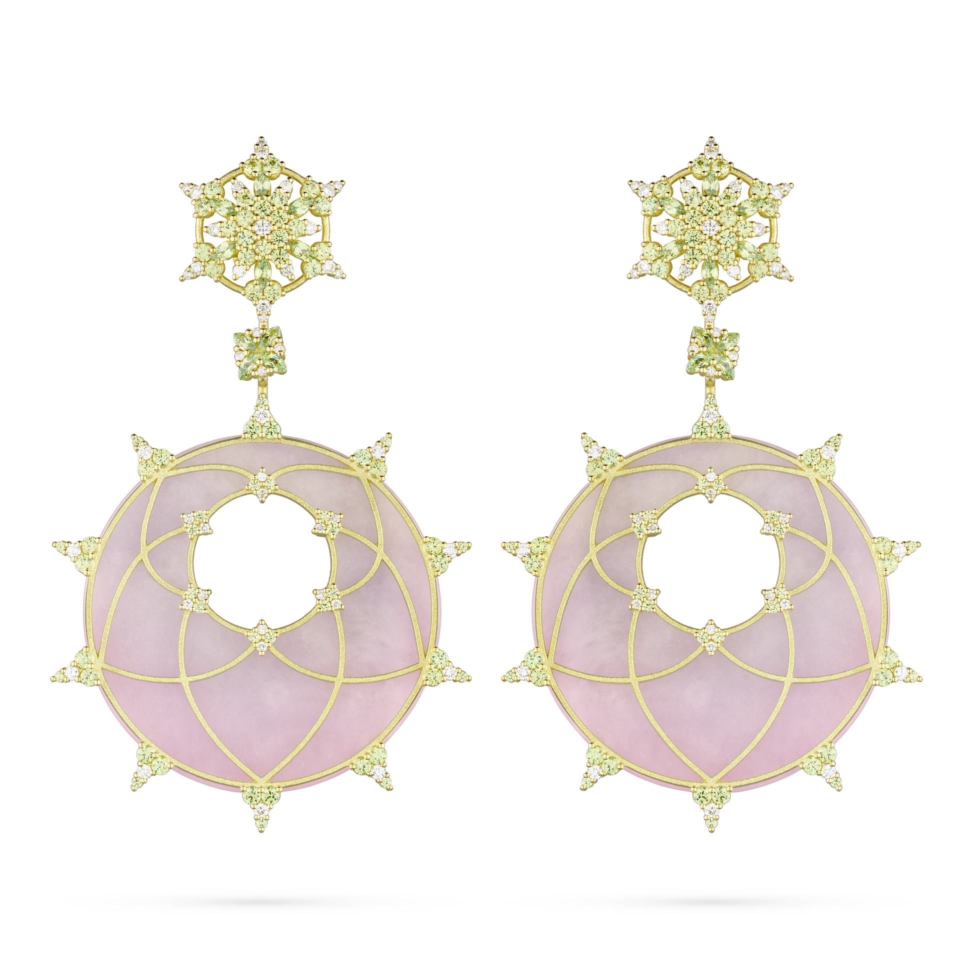 18k yellow gold with brilliant cut white diamonds (.87 carats), demantoid garnet (3.10 carats) and lavender jade discs. 34mm; secured with a post/clutch.