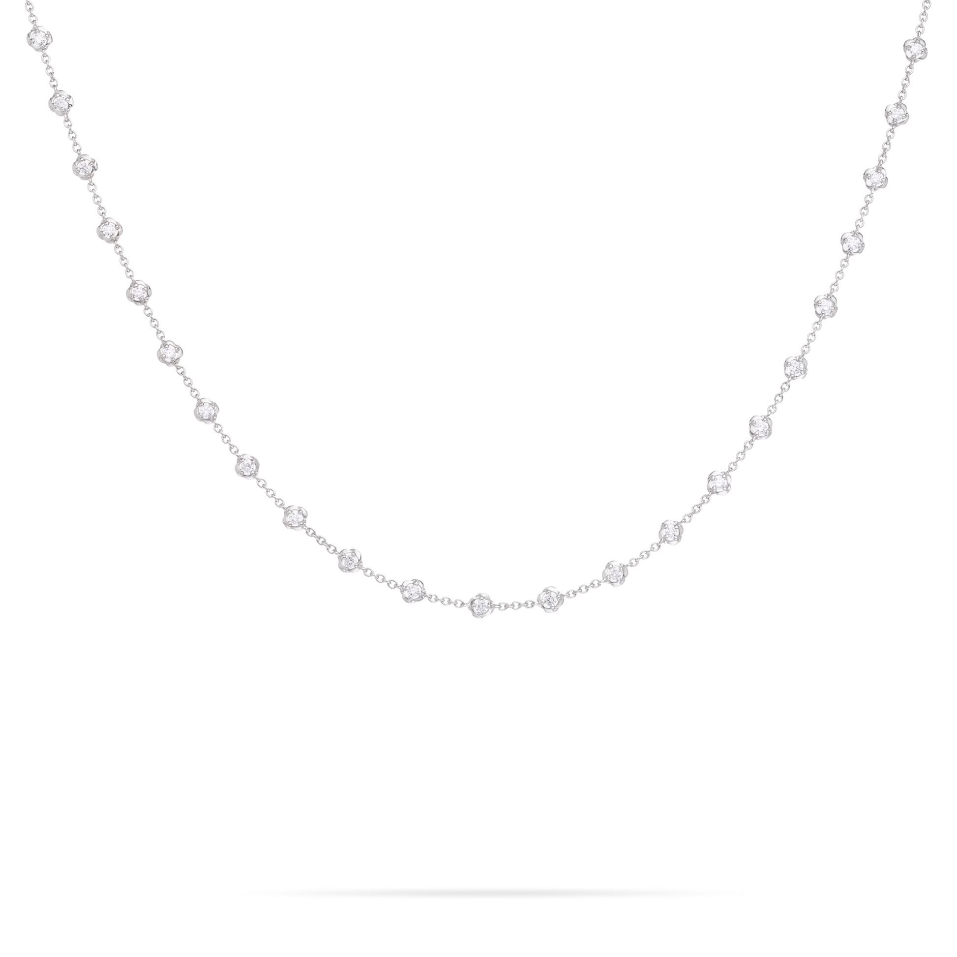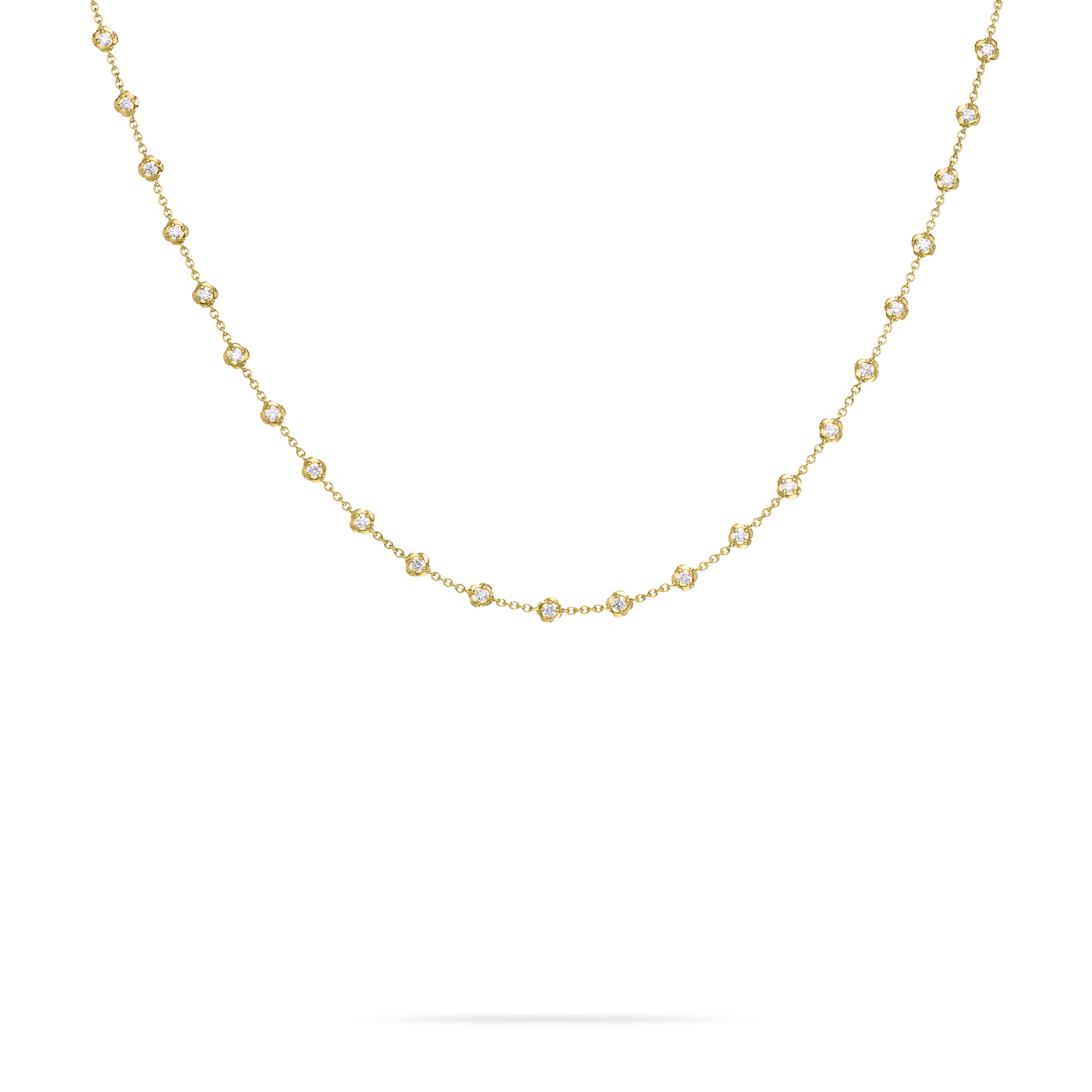 Floating brilliant-cut diamonds orbit a chain of whisper-thin gold.