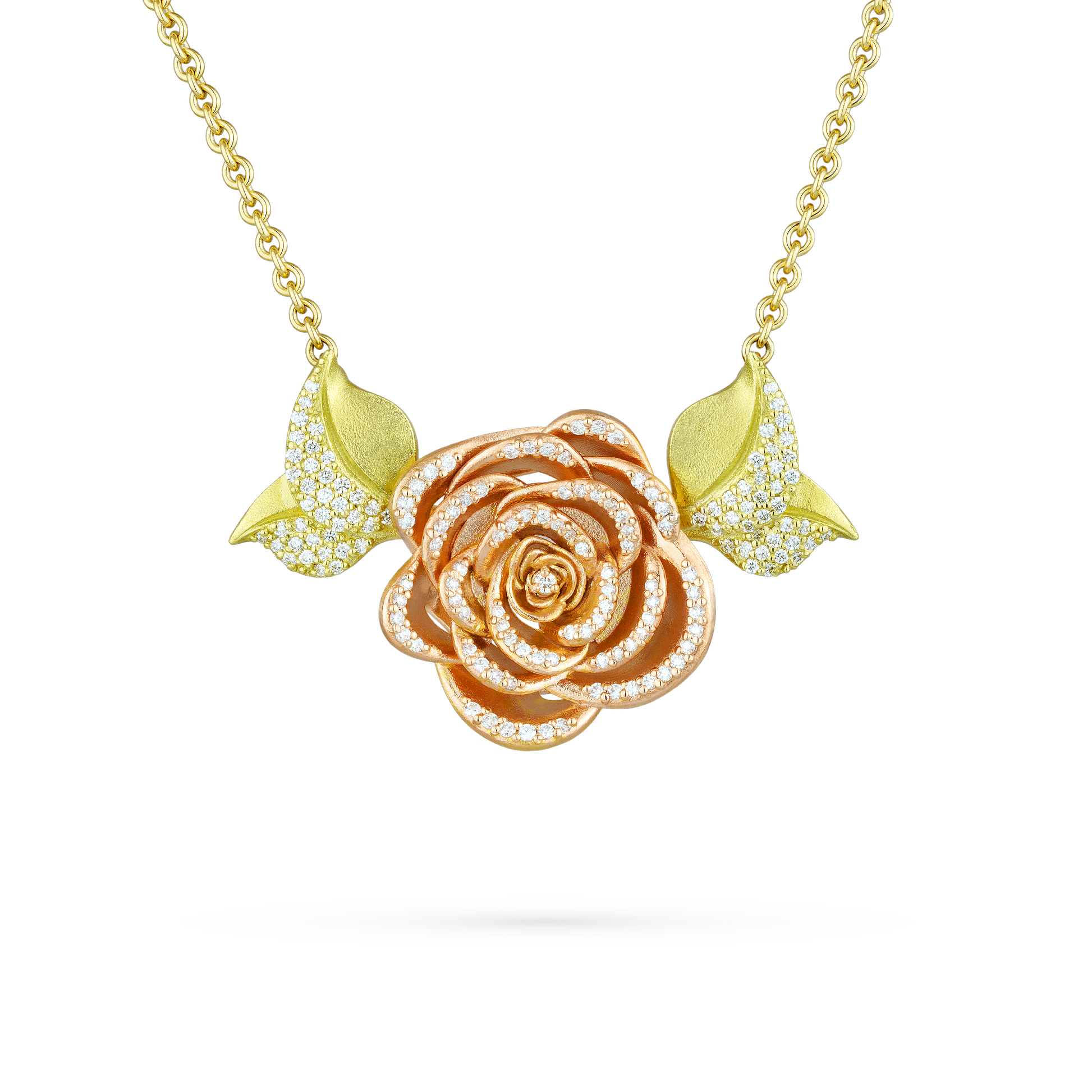 18k rose gold and green gold with brilliant cut round white diamonds (.82 carats). 18″ long; secured with a lobster claw clasp.