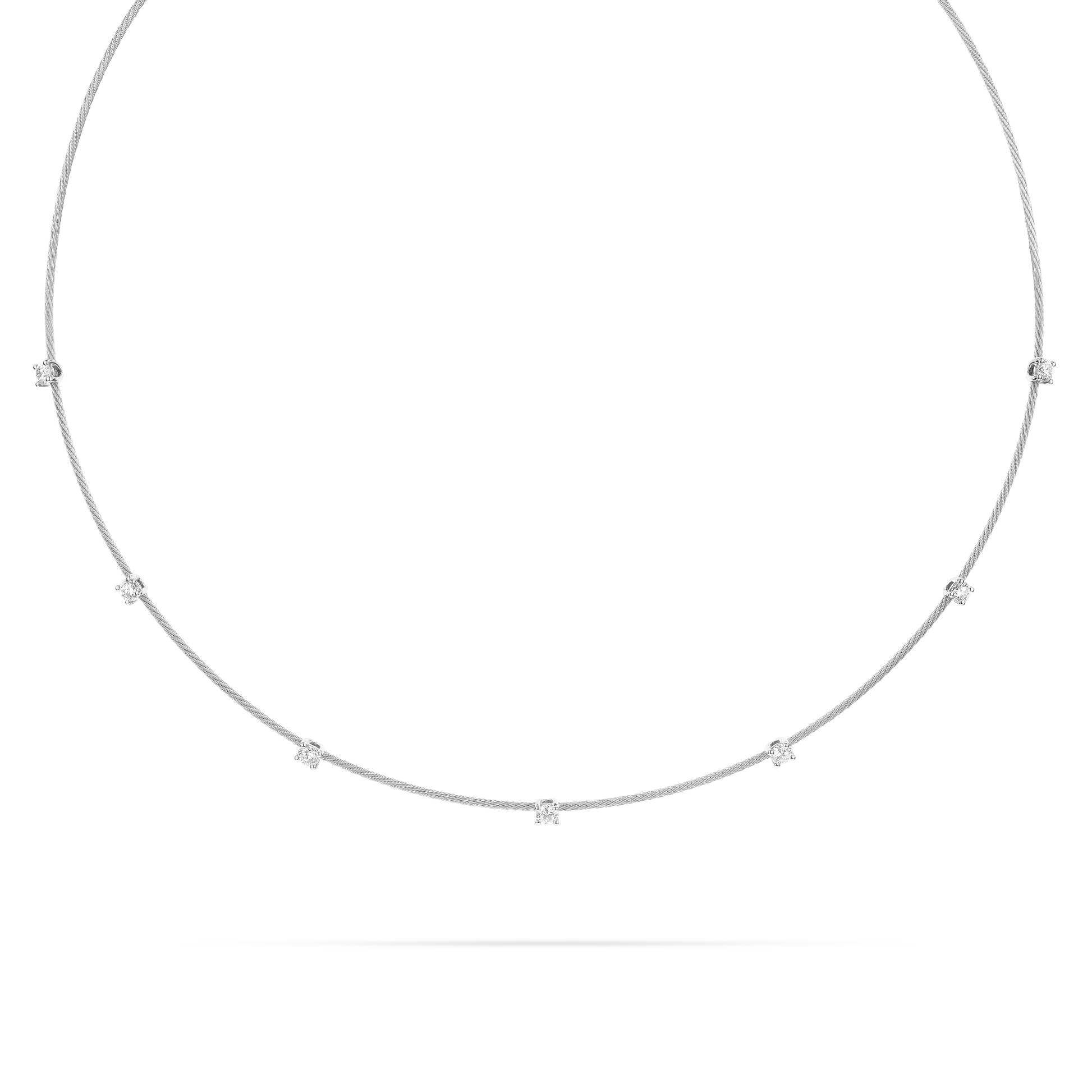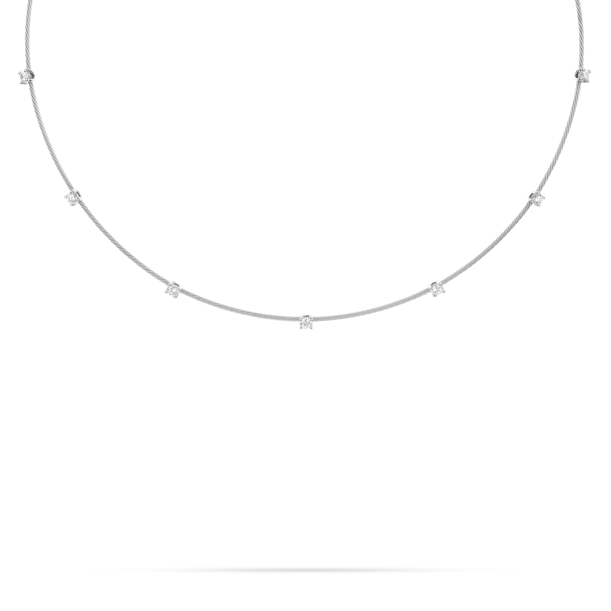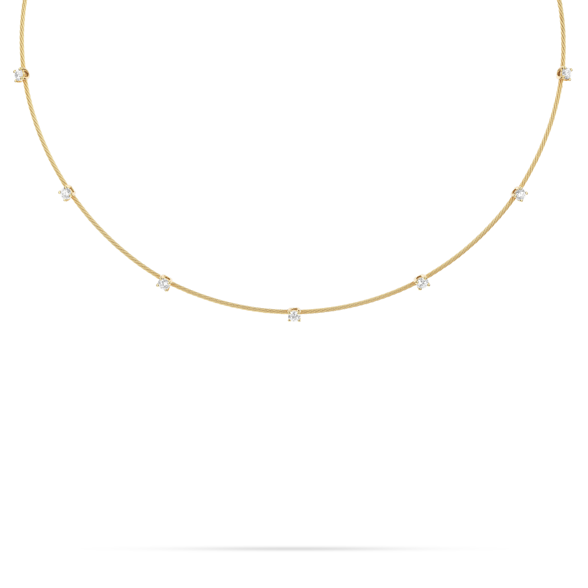 1.2mm 18k yellow gold wire with 7 brilliant cut white diamonds (.70 carats). 16″ long; secured with a resistant tension clasp and safety latch.