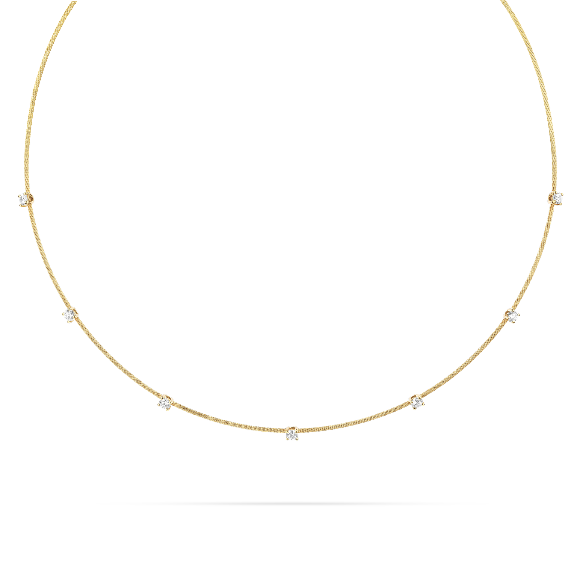 Ethereal yet industrial, a flexible gold strand is studded with 7 round diamonds for a simple, understated effect.