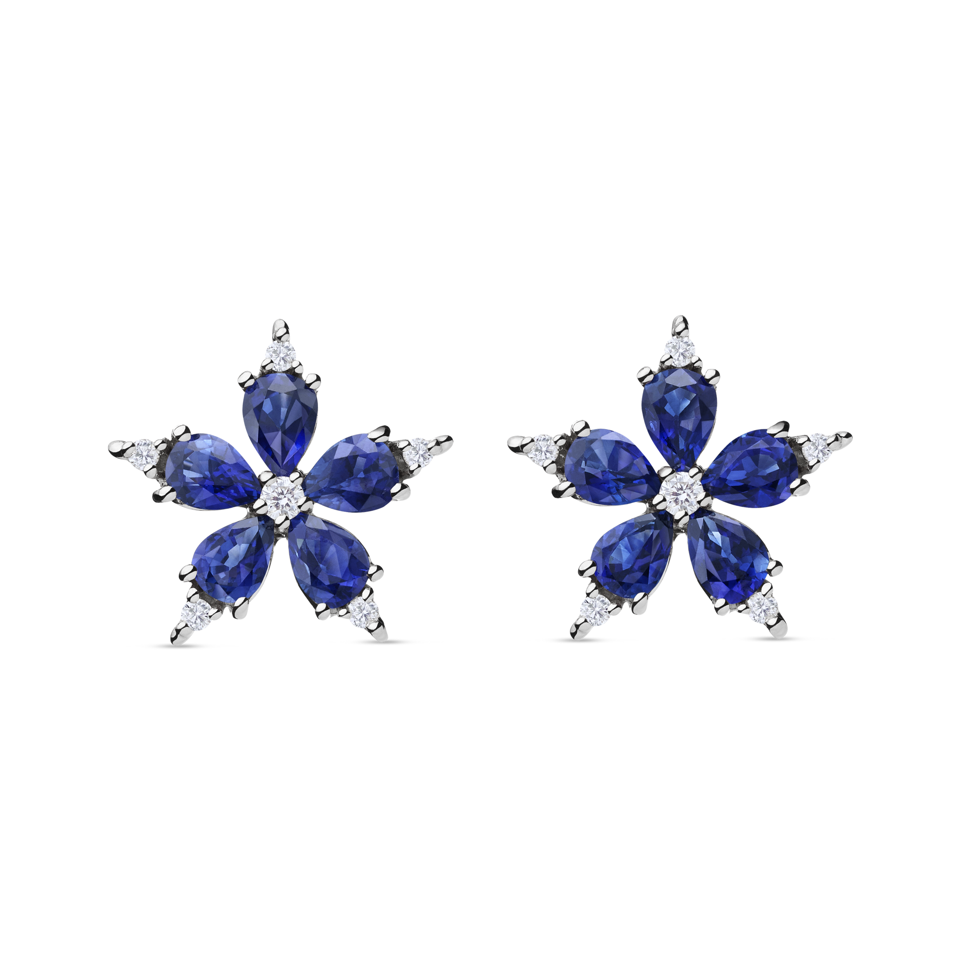 18k white gold with brilliant cut white diamonds (.15 carats), and blue sapphires (1.80 carats). 13mm diameter; secured with a post/clutch.
