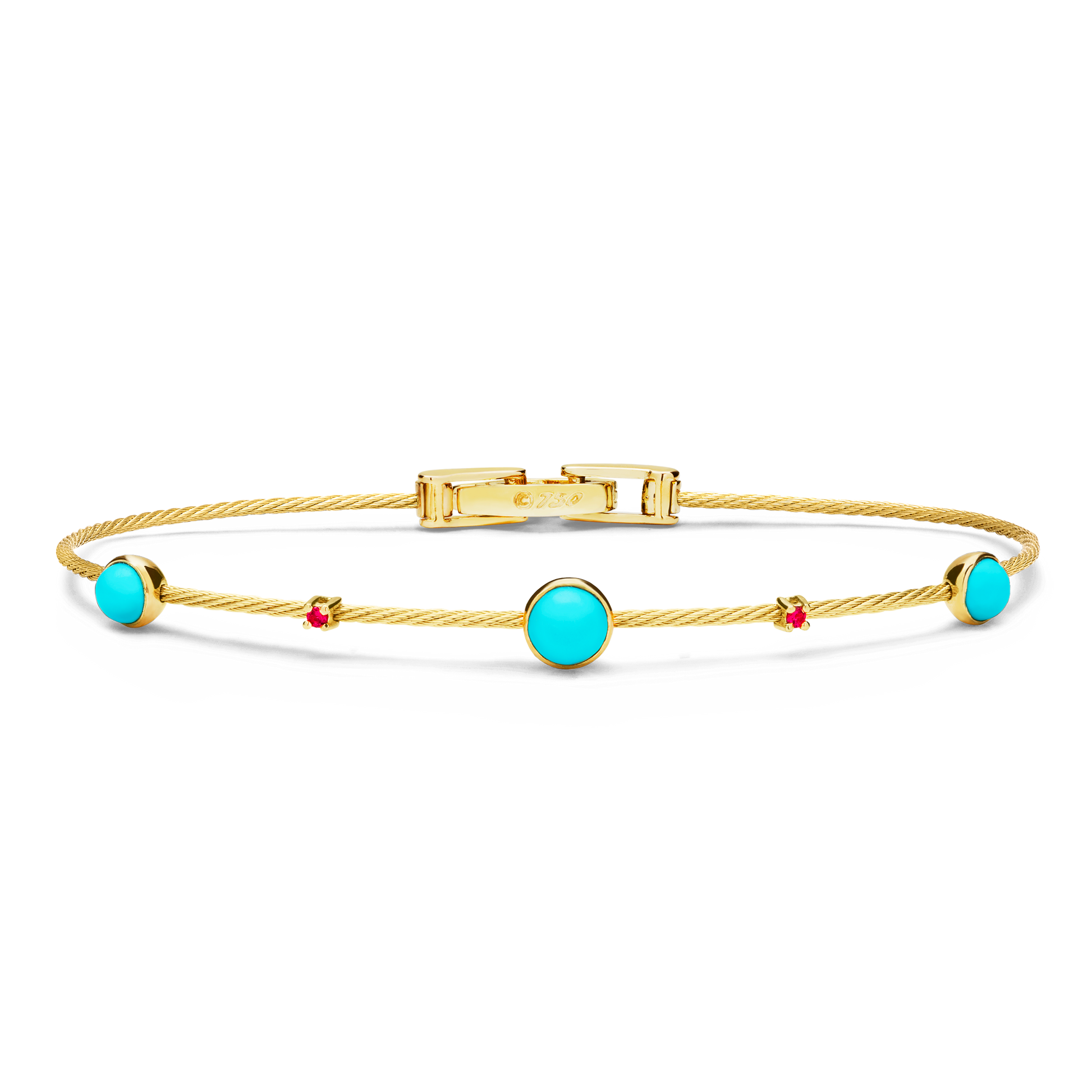 1.2mm 18k yellow gold wire with 3 cabochon turquoise and 2 rubies (.02 carats). Secured with a snapover door clasp.