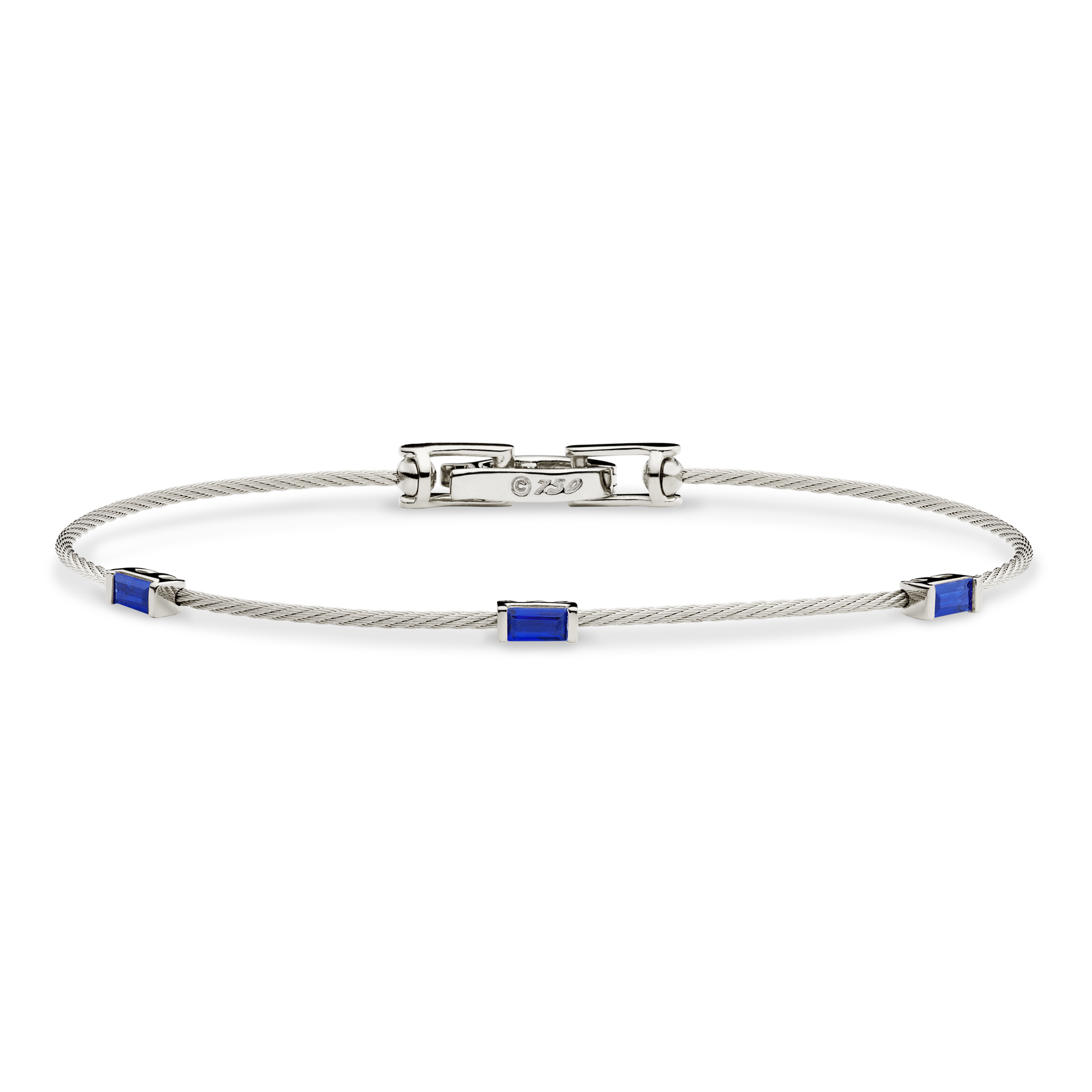 Ethereal yet industrial, a flexible gold strand is studded with 3 baguettes for a simple, understated effect. Wear it alone or pair them together.